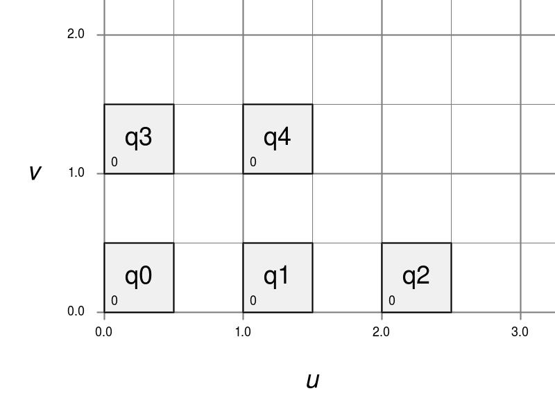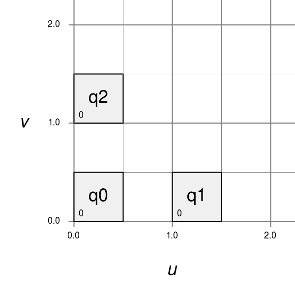 To embed sub-face coordinates in a single (u,v) pair, Bfr tiles the sub-faces in disjoint regions in parameter space. This tiling is similar to the Udim convention for textures, where a UDim on the order of sqrt(N) is used to preserve accuracy for increasing N: