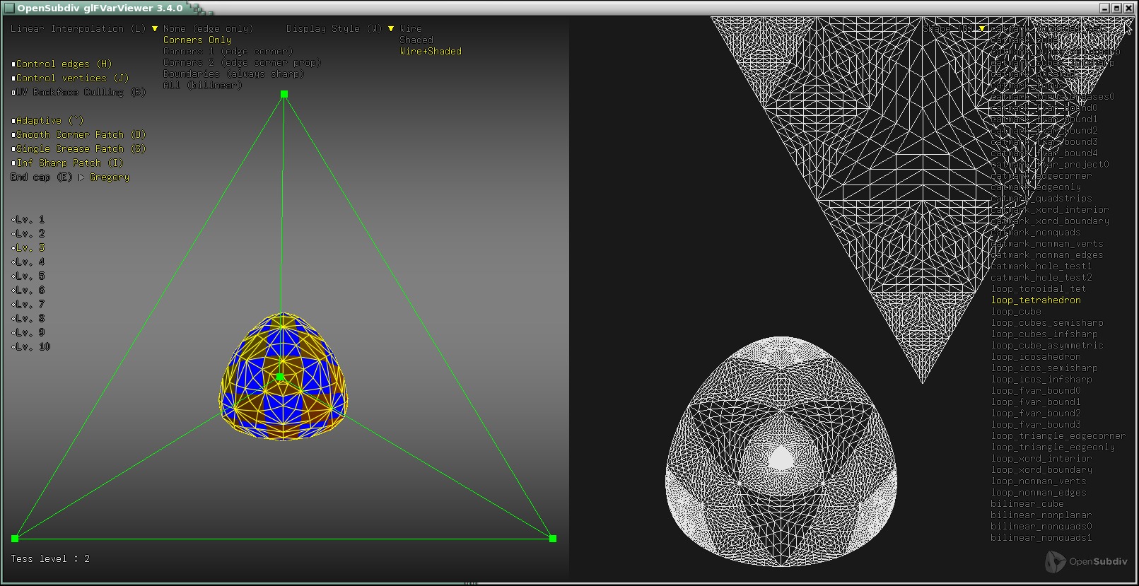 Other examples : glViewer, glFVarViewer, glEvalLimit, glStencilViewer, glPtexViewer, glPaintTest, glShareTopology, dxViewer, dxPtexViewer,