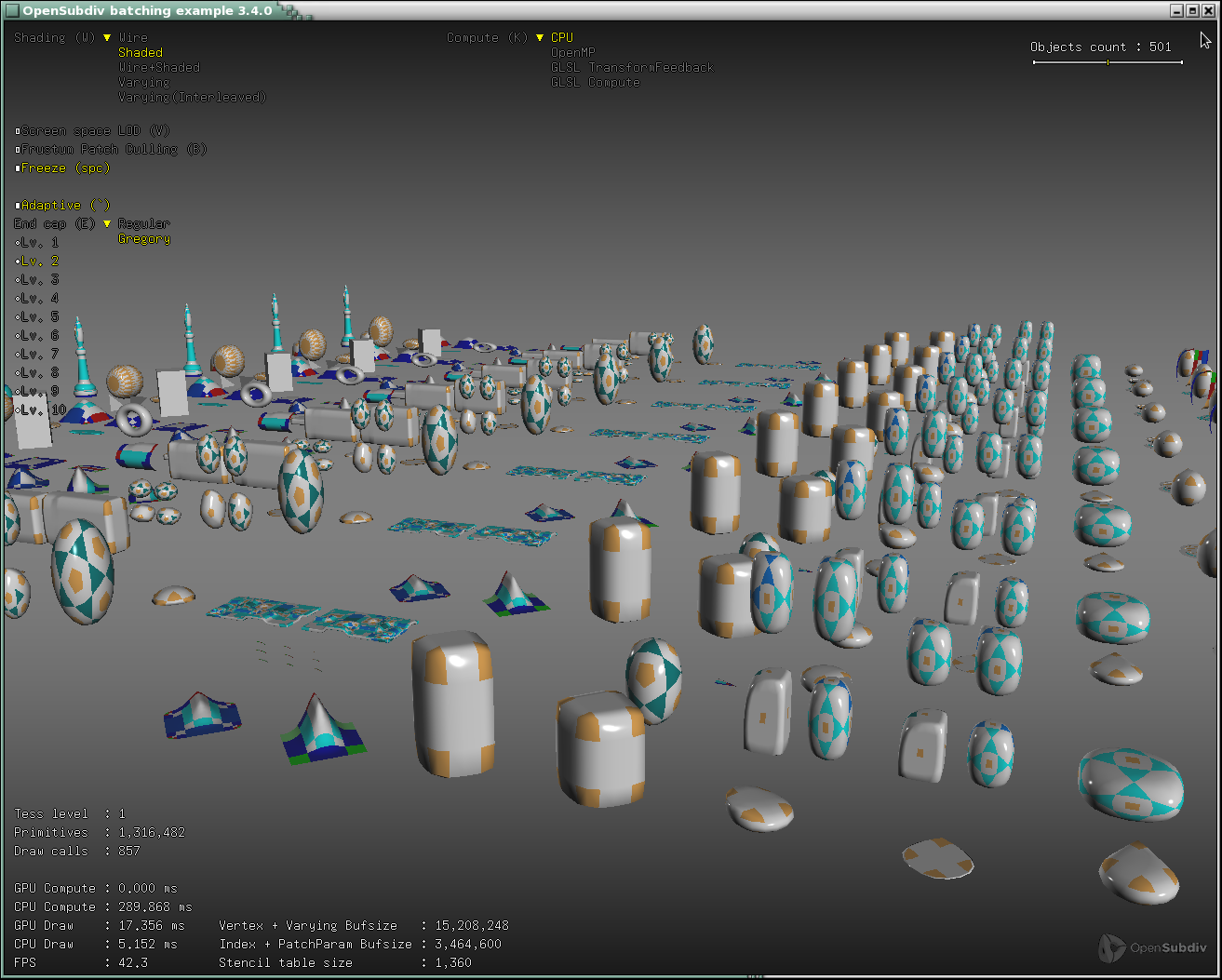 Other examples : glViewer, glFVarViewer, glEvalLimit, glStencilViewer, glPtexViewer, glPaintTest, glShareTopology, dxViewer, dxPtexViewer,