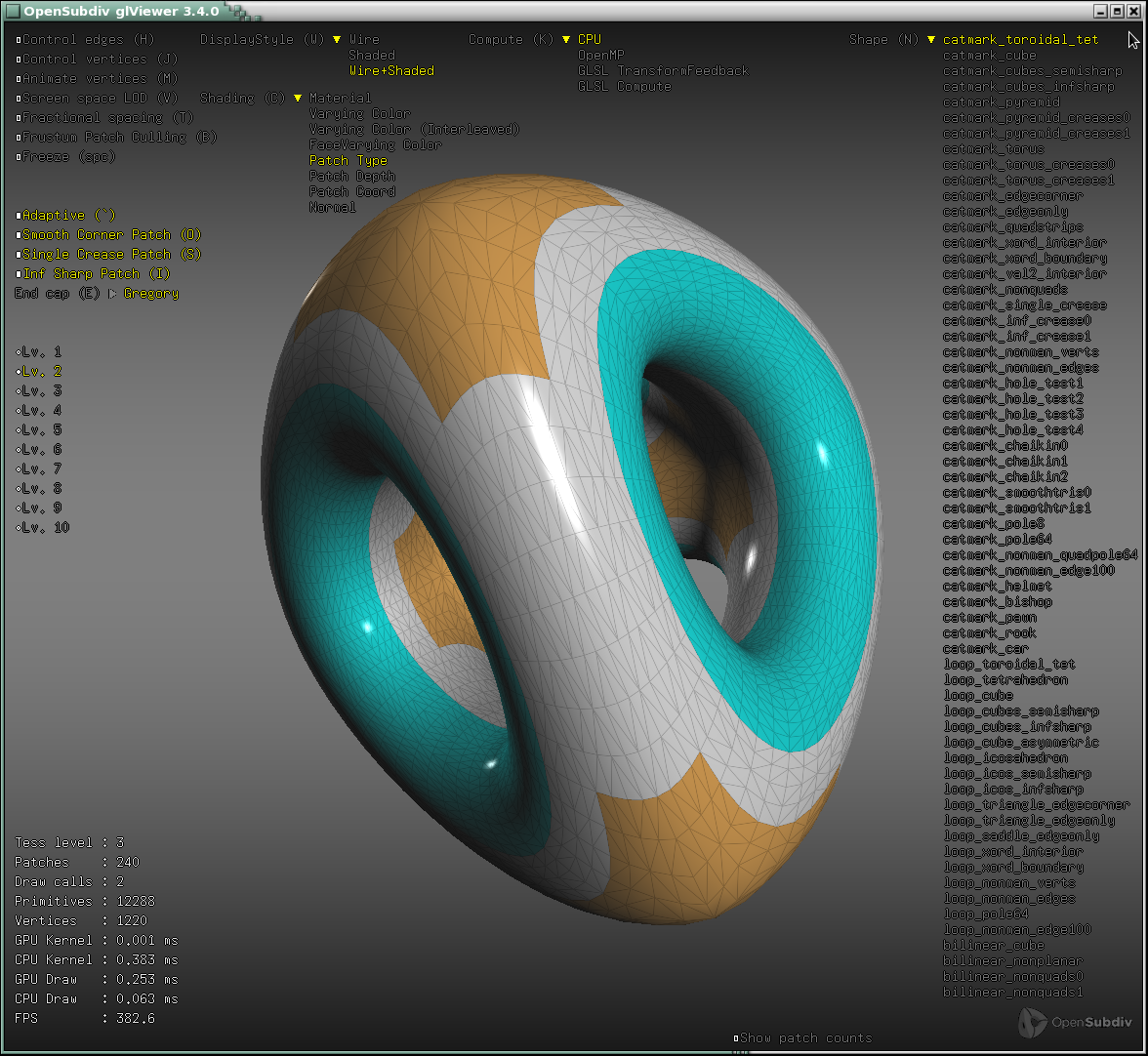 Other examples : glViewer, glFVarViewer, glEvalLimit, glStencilViewer, glPtexViewer, glPaintTest, glShareTopology, dxViewer, dxPtexViewer,