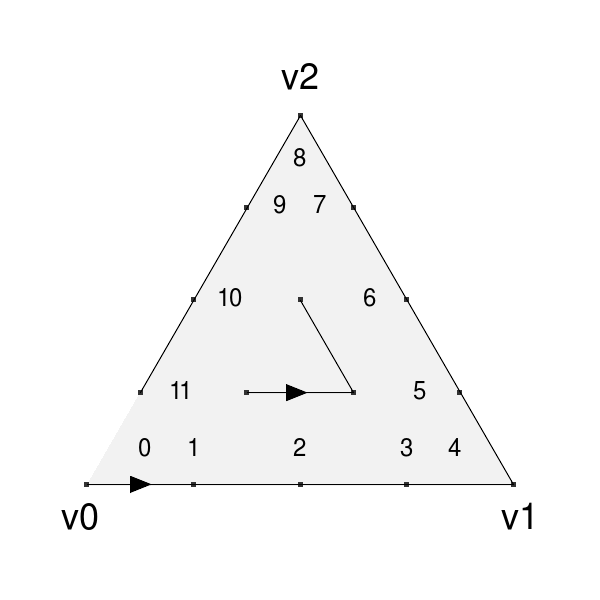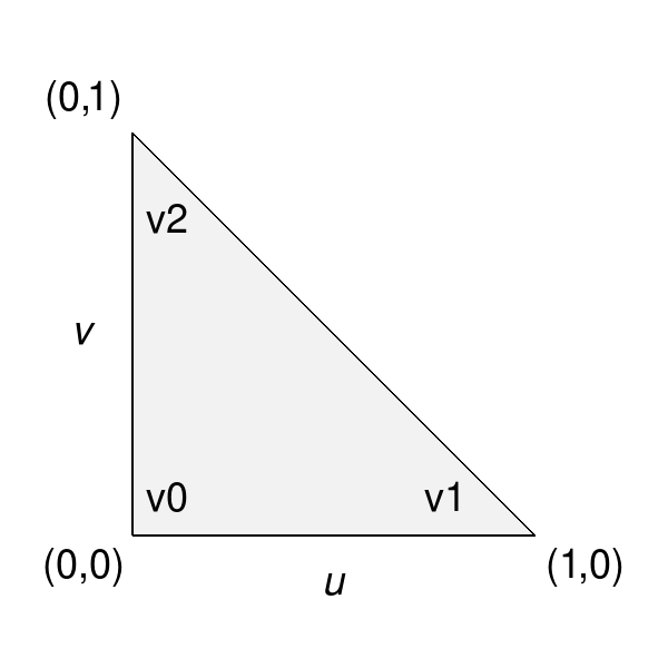 Note that triangles are often parameterized elsewhere in terms of barycentric coordinates (u,v,w) where w = 1 - u - v. As is the case elsewhere in OpenSubdiv, Bfr considers parametric coordinates as 2D (u,v) pairs for all purposes. All faces have an implicit 2D local parameterization and all interfaces requiring parametric coordinates consider only the (u,v) pair. If interaction with some other tool set requiring barycentric coordinates for triangles is necessary, it is left to users to compute the implicit w accordingly.