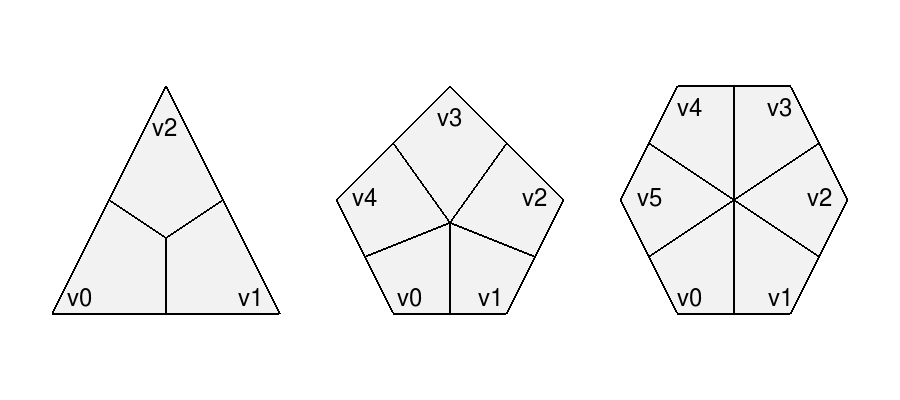 Each face of the mesh has an implicit local 2D parameterization and individual coordinates of that parameterization are used to evaluate its corresponding Surface. In general, 3- and 4-sided faces use the same parameterizations for quad and triangular patches used elsewhere in OpenSubdiv: