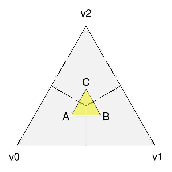 A triangle subdivided with a quad-based scheme (e.g. Catmull-Clark) will therefore not have the parameterization of the triangular patch indicated previously, but another defined by its quad sub-faces illustrated above (to be described in more detail below).