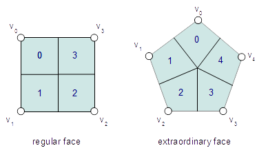 In this diagram, the indices of the vertices of the base face are marked in red; so on the left we have an extraordinary Catmull-Clark face with five vertices (labeled 0-4) and on the right we have a regular Catmull-Clark face with four vertices (labelled 0-3). The indices of the child faces are blue; note that in both the extraordinary and regular cases, the child faces are indexed the same way, i.e. the sub-face labeled n has one incident vertex that is the result of the subdivision of the parent vertex also labeled n in the parent face. Specifically, we note that the sub-face 1 in both the regular and extraordinary face is nearest to the vertex labelled 1 in the parent.
